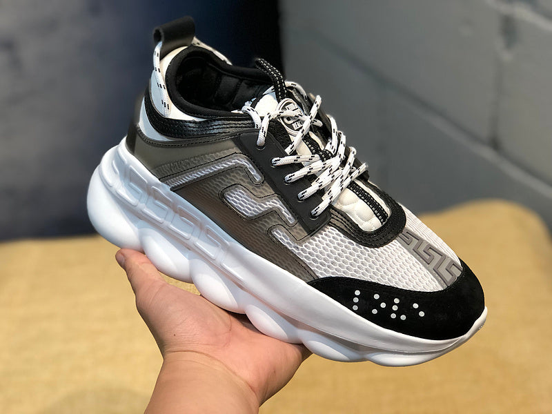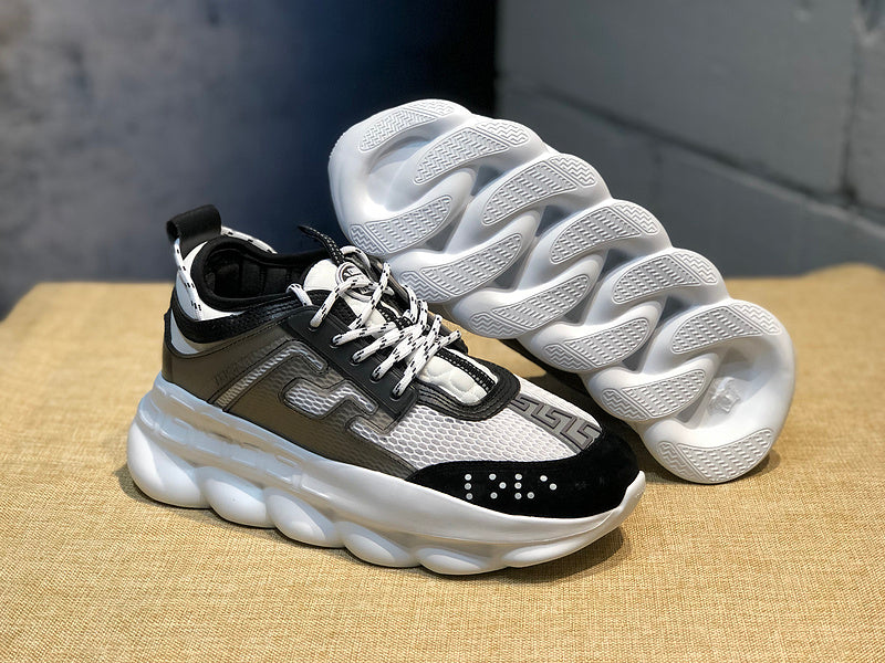 Las Chain Reaction lucen una suela de goma con eslabones de cadena inspirada en las icónicas joyas de cadena de Versace. Entre los elementos Versace característicos de estas zapatillas se incluyen el icónico diseño Greek Key, el parche con logotipo Chain Reaction.
