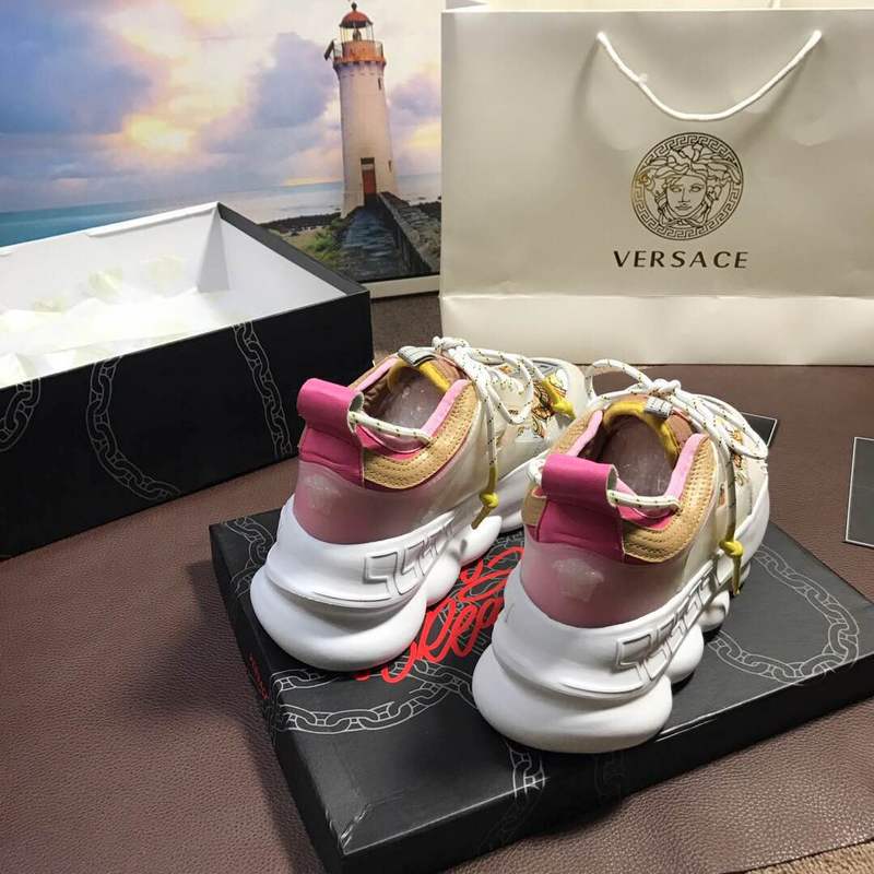 Las Chain Reaction lucen una suela de goma con eslabones de cadena inspirada en las icónicas joyas de cadena de Versace. Entre los elementos Versace característicos de estas zapatillas se incluyen el icónico diseño Greek Key, el parche con logotipo Chain Reaction.